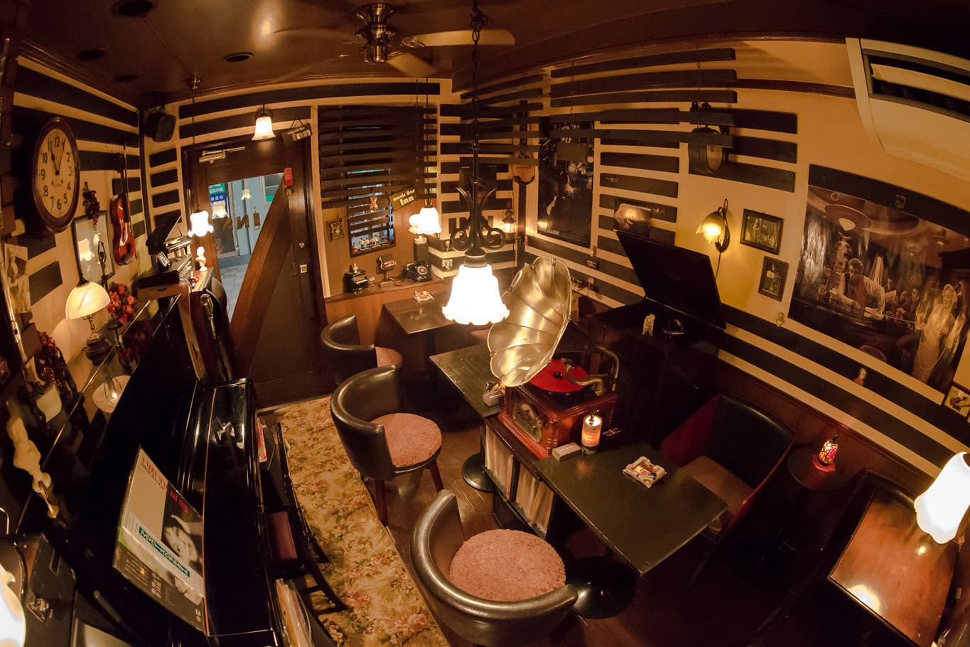 木調手創りの店内には、間接照明の25個のオレンジ色の光のランプが雰囲気をかもし出しています。